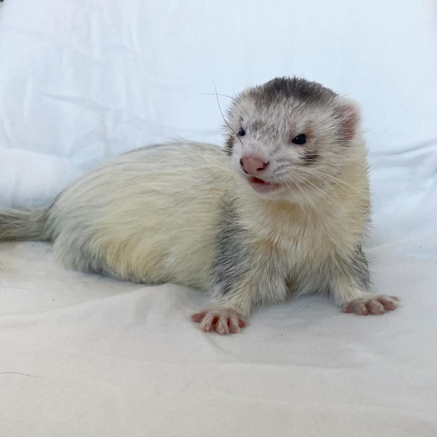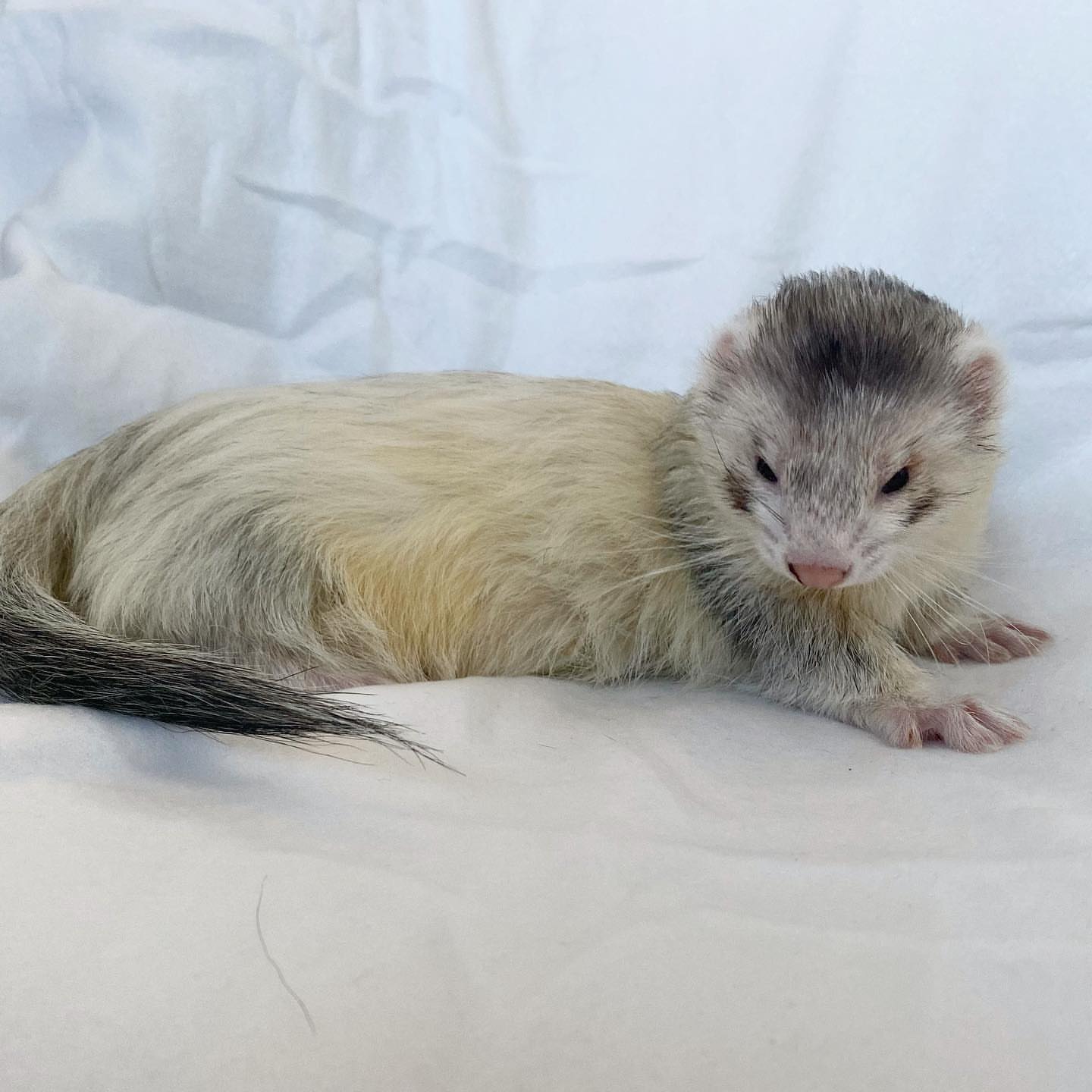 This lovely cream sable ferret features a soft pale coat with subtle grey shading around the neck and a darker tail, giving it a unique and elegant look. It has a healthy, well-balanced body and a smooth, fluffy coat. Playful, curious, and friendly, this ferret enjoys exploring and interacting with people. With proper care and attention, it will make a loving, fun, and engaging companion.