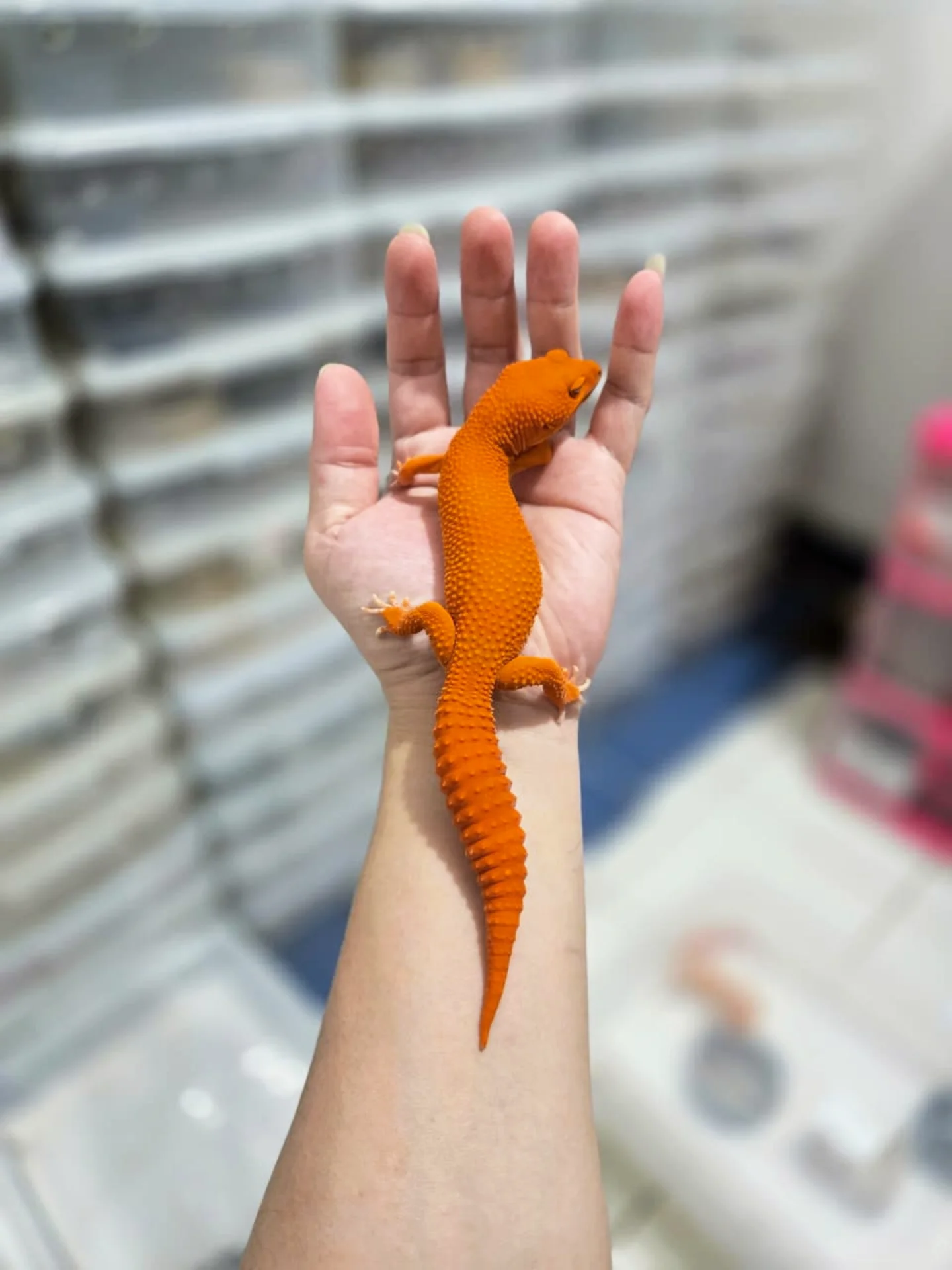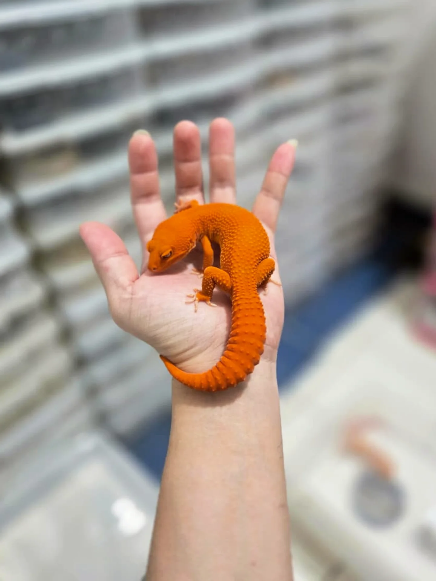This stunning Super Orange Leopard Gecko features an intense, vibrant orange coloration with a healthy, well-fed body and smooth texture. Calm, easy to handle, and perfect for both beginners and experienced reptile lovers.